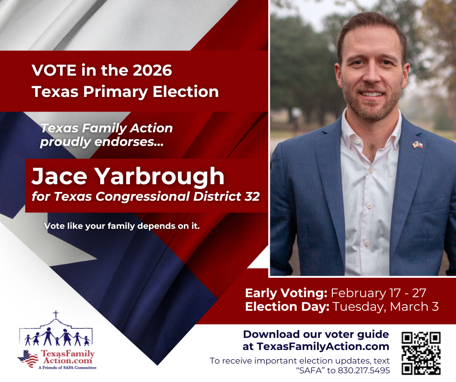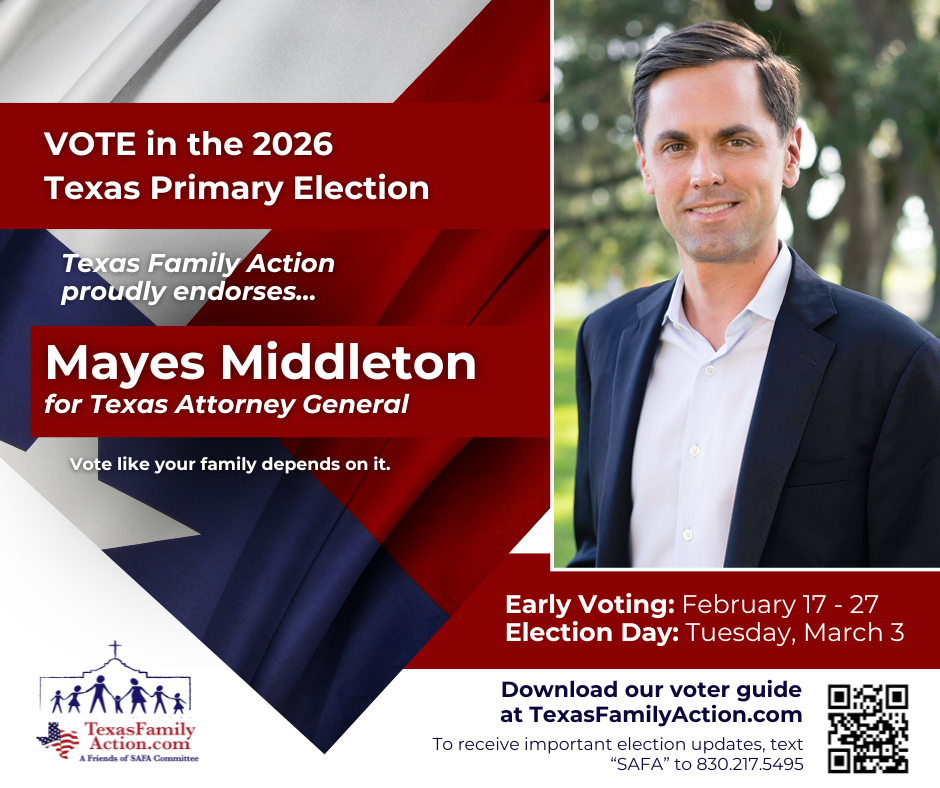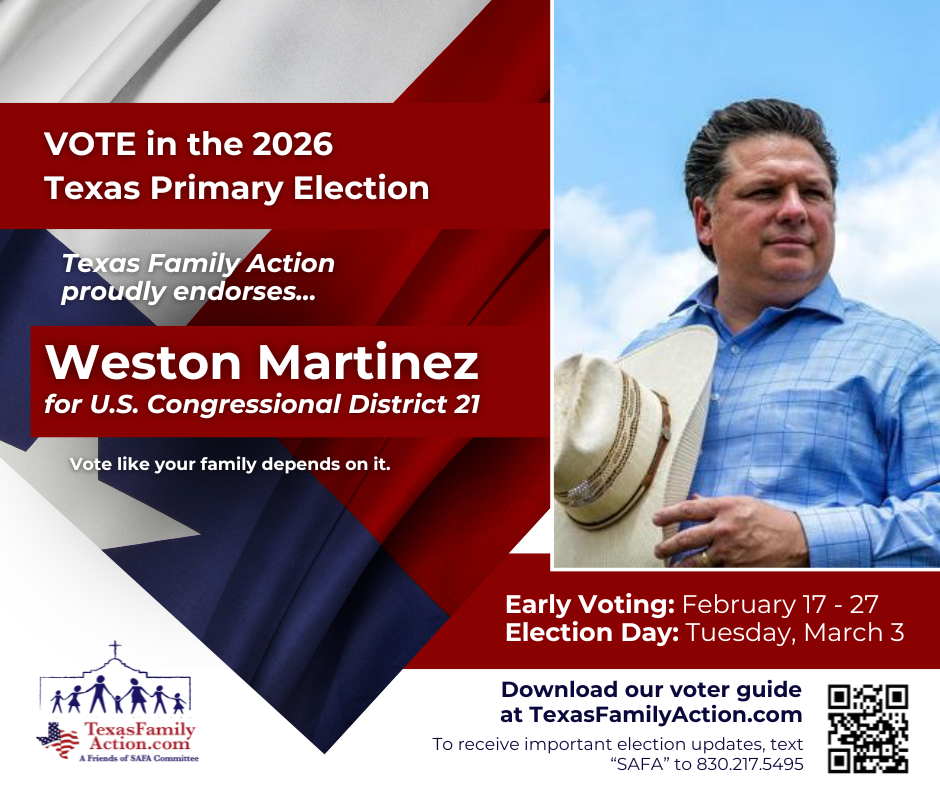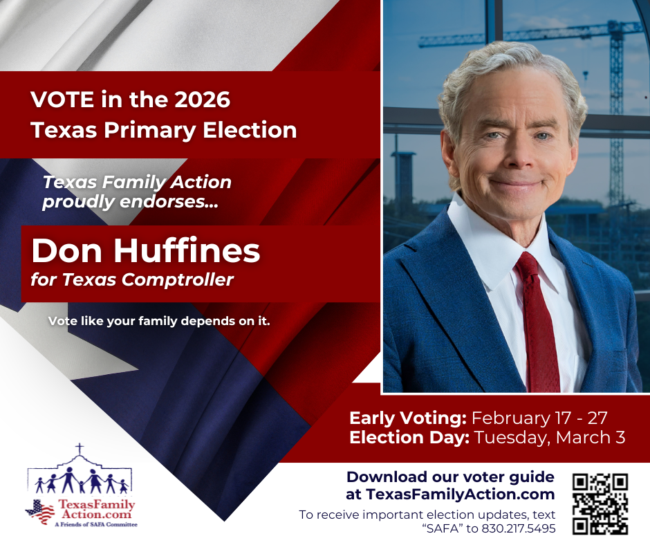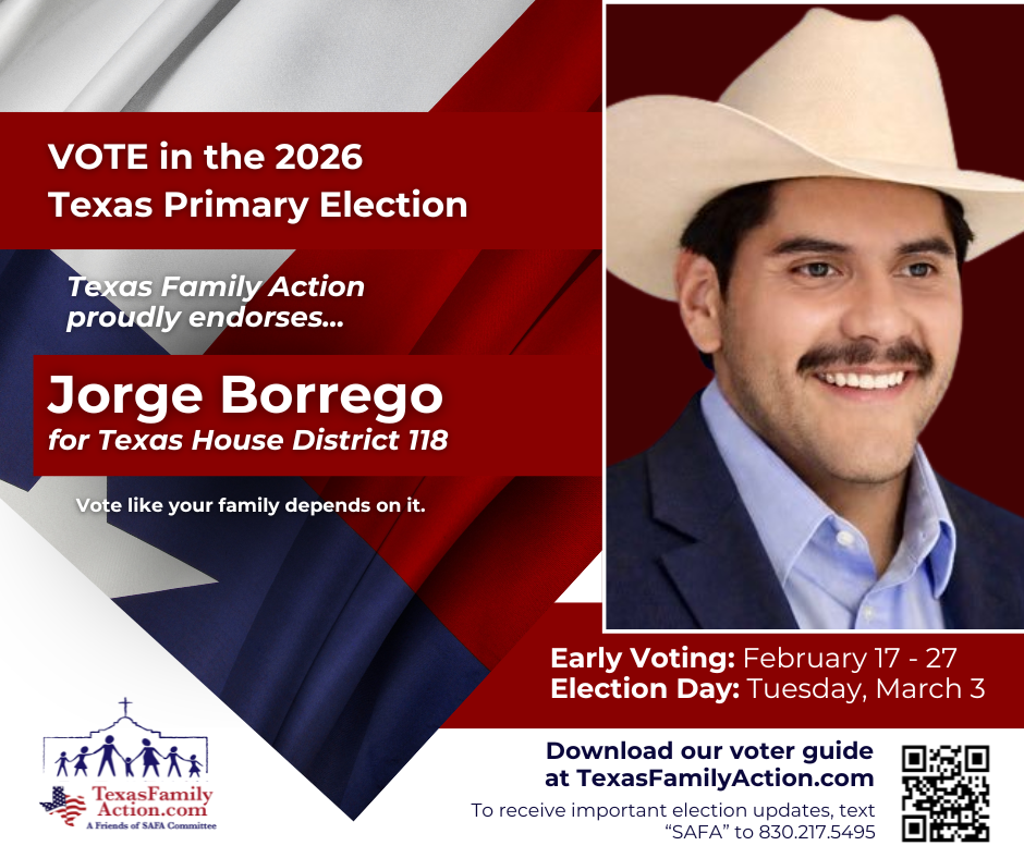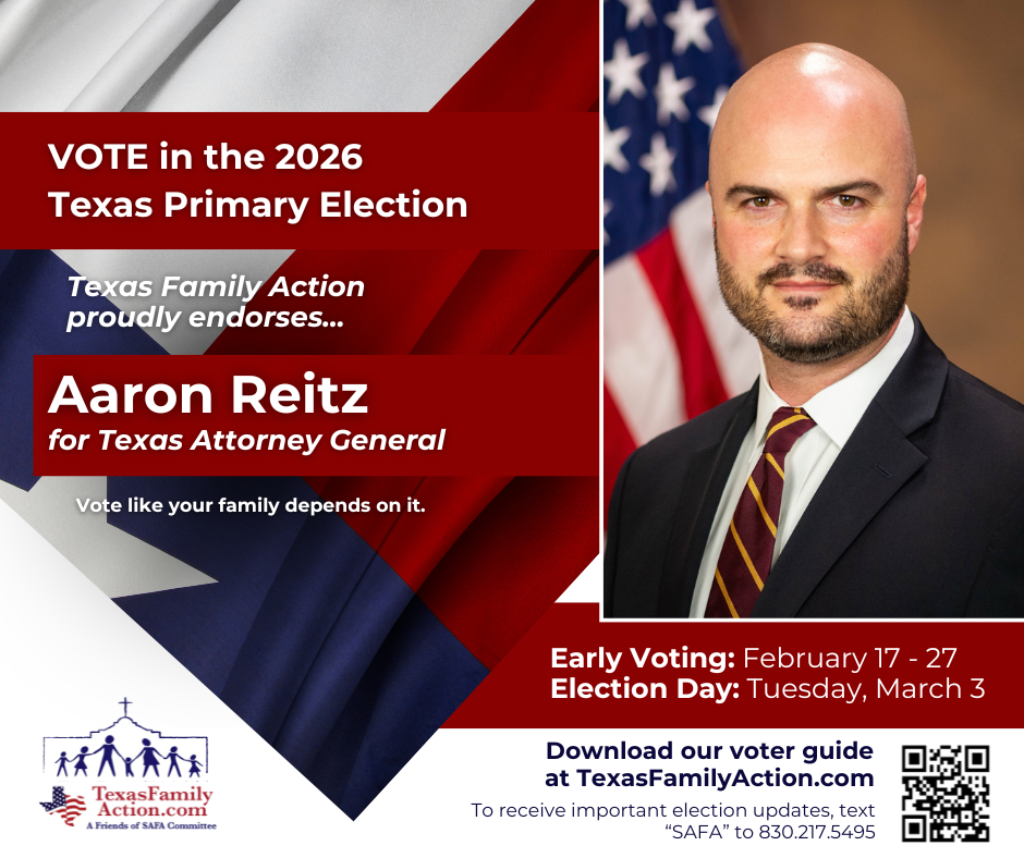 THE MISSION OF TEXAS FAMILY ACTIONTo educate, vette, and advocate for political candidates who courageously and consistently protect, defend, and promote the family so good and meaningful change can be made at the local, state, and federal level. Texas Family Action Proudly Endorses… Federal Race Endorsements State Race Endorsements Local Race Endorsements Download Our FREE Family Voter Guide Download the Family Voter Guide